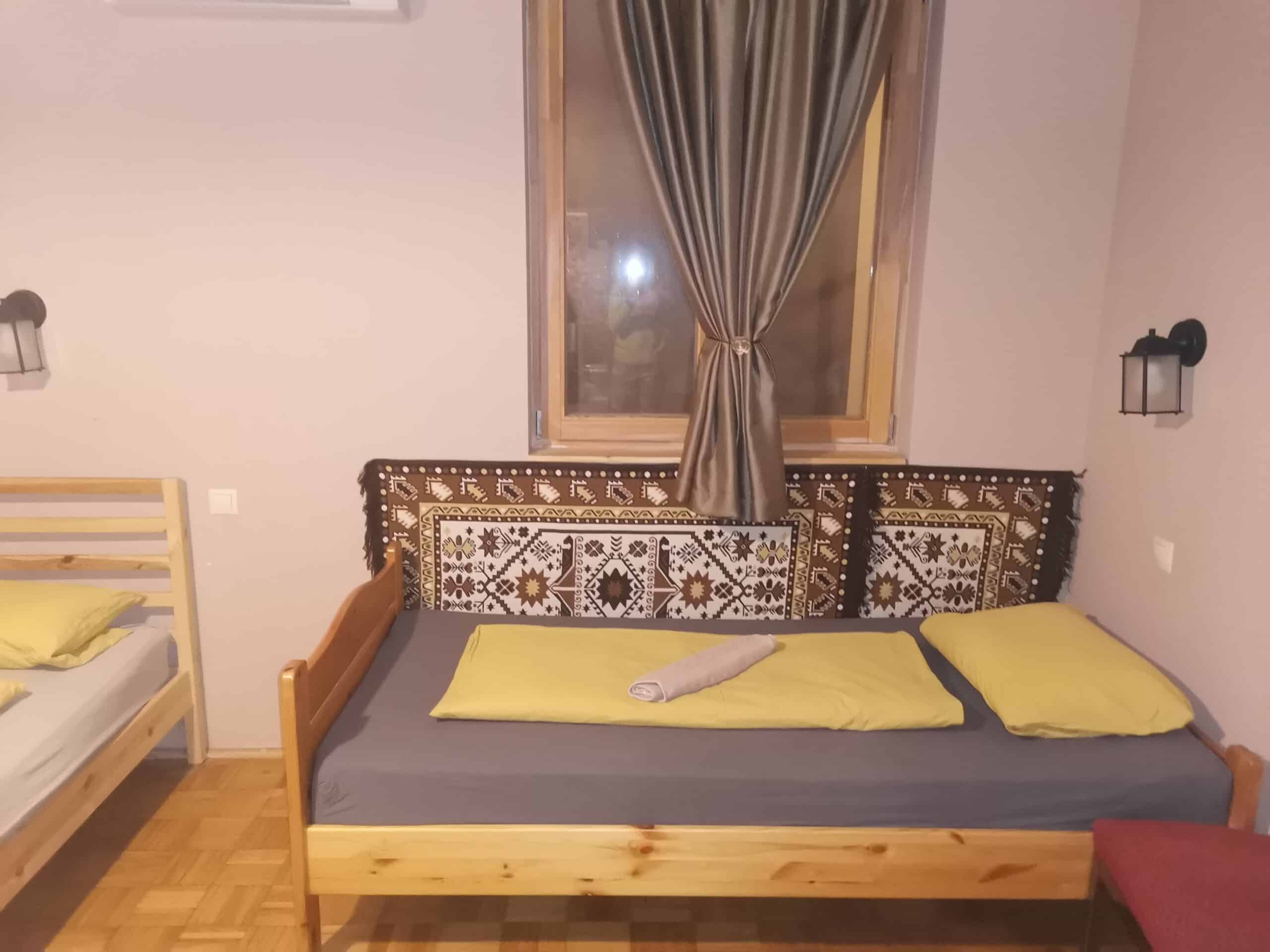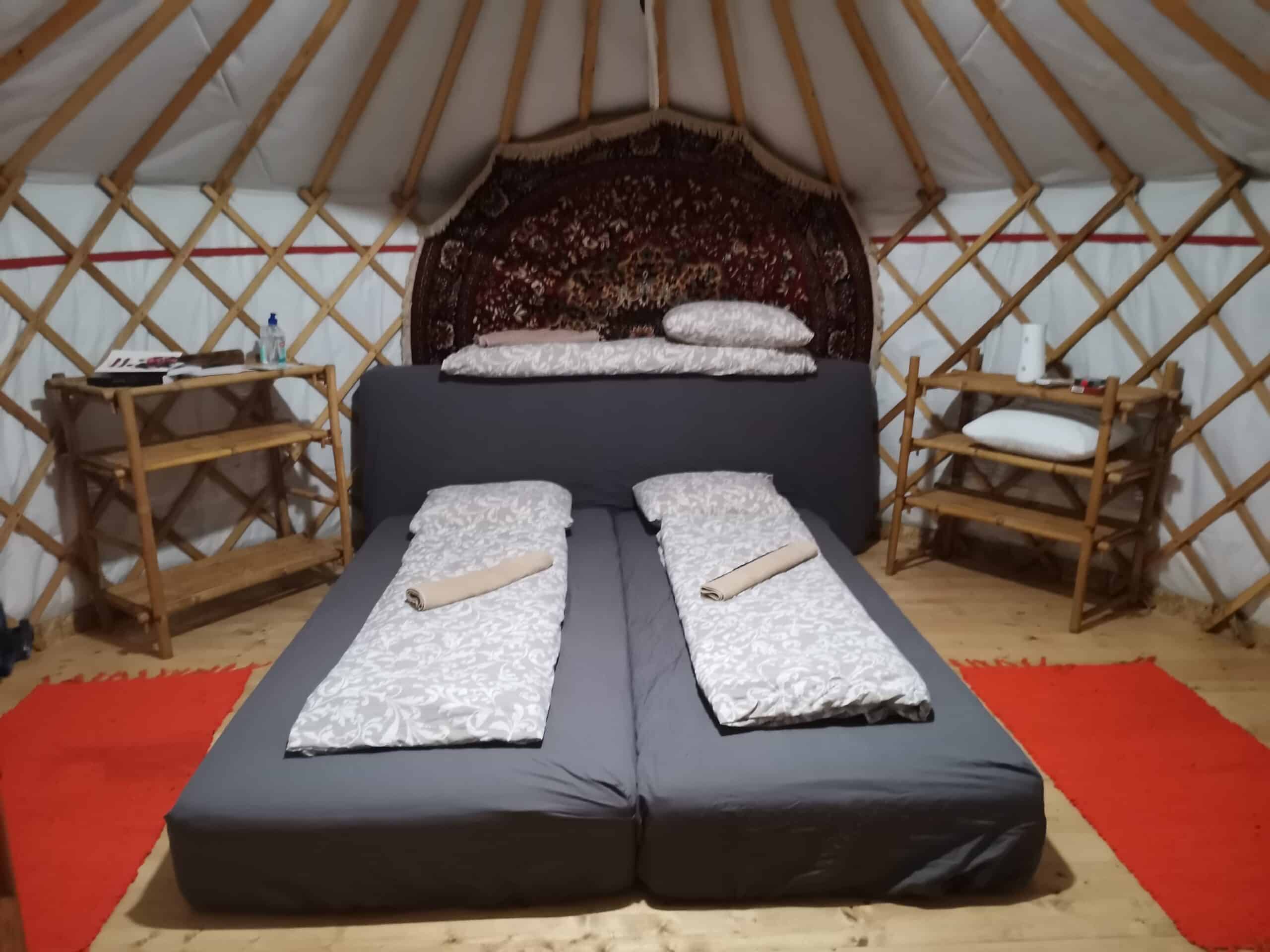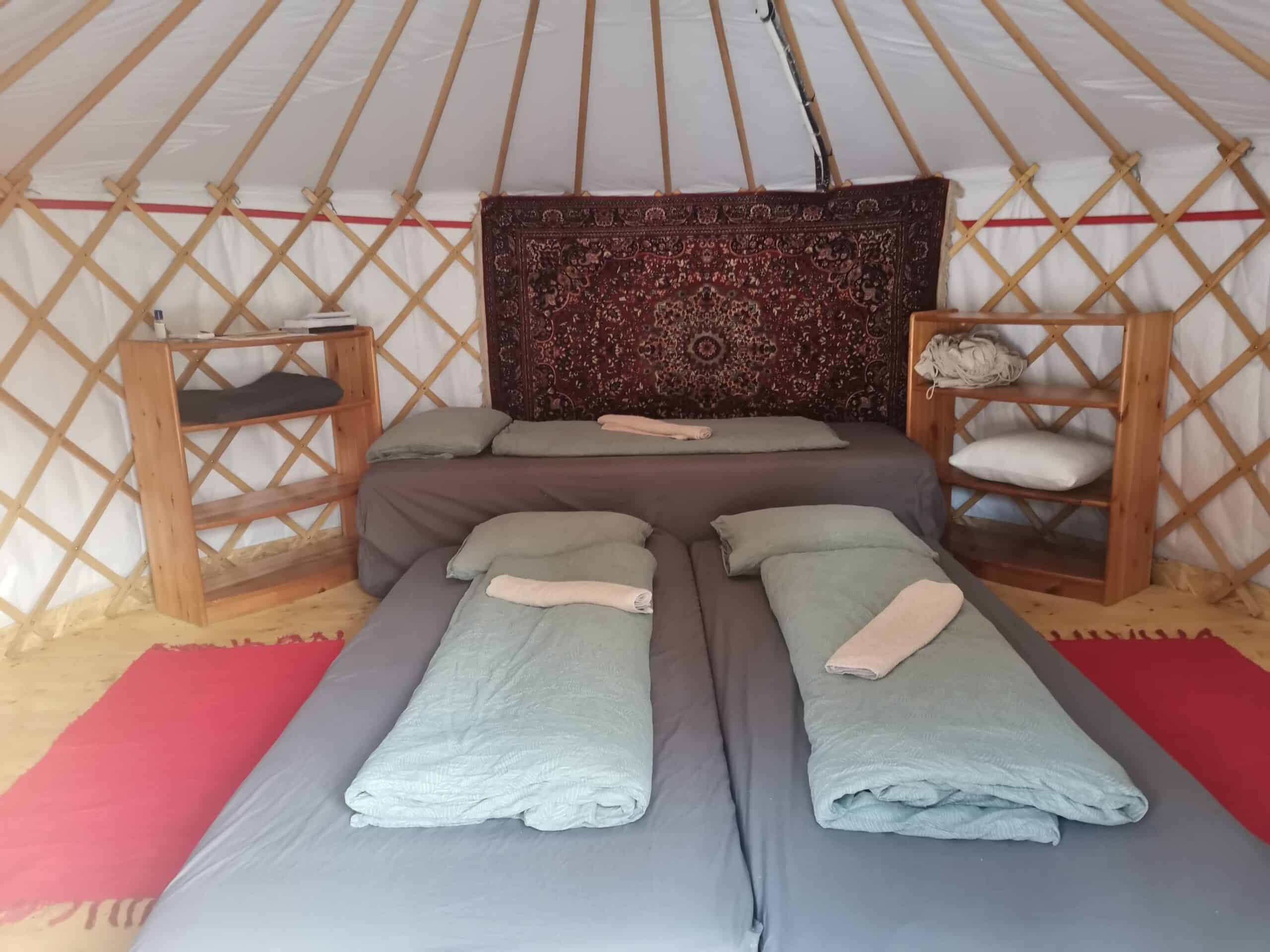 Az összkomfortos apartmanban két hálószoba, egy hatalmas 16 személyes nappali-étkező, továbbá fürdőszoba és konyha található, amely összesen 6 felnőttnek és 2 kisgyermeknek (kiságyakban) biztosít szállást. A három jurta 3-3 személyes, így összesen, az apartmannal együtt 15 fő és további 2 kisgyermek szállásolható el.